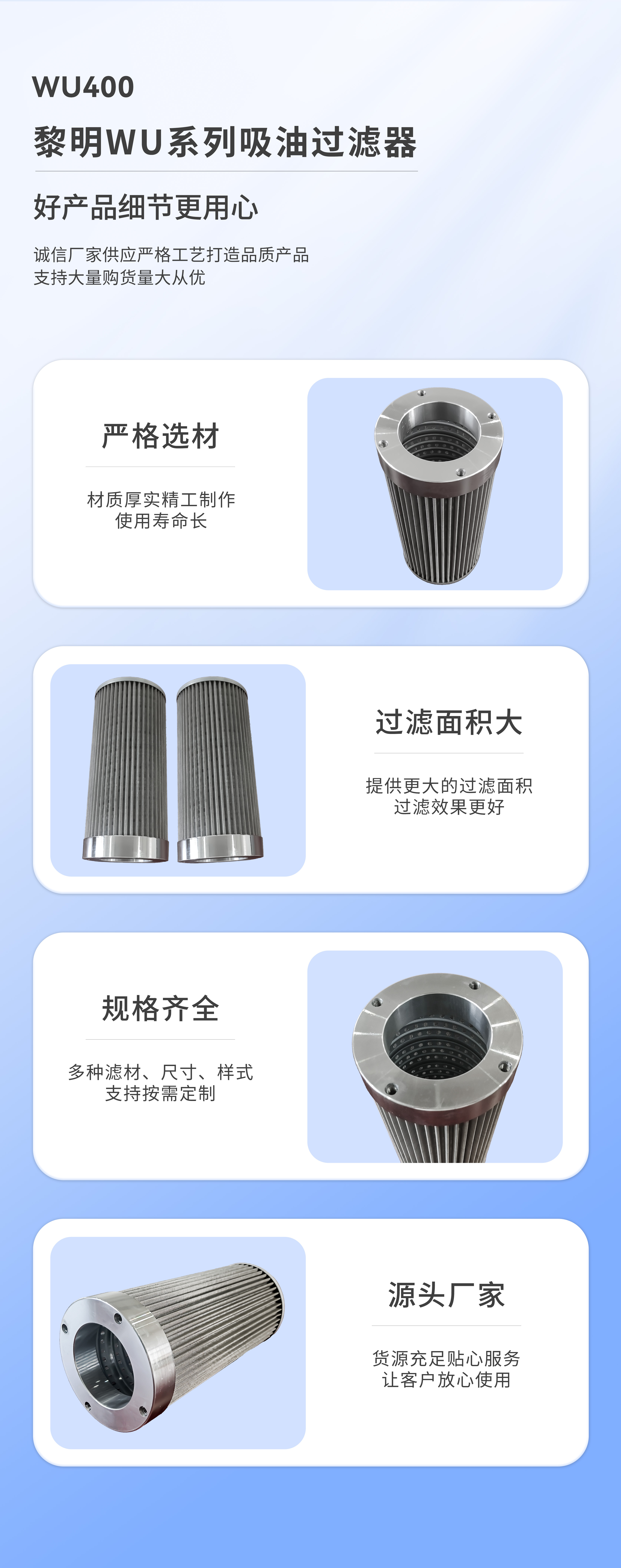 【產(chǎn)品簡介】:液壓濾芯由上、下端蓋,濾層(由過濾層、支撐層、均流層)以及骨架組成,濾層以圓柱體的形狀以圓柱體的形狀固定在內(nèi)、外骨架之間,并在上、下端蓋處密封,應用時根據(jù)實際情況確定液體的流動方向(從濾芯外流向濾芯內(nèi)部或從內(nèi)部流向外部)。流量:400L/min 精度:80、100、180微米可選。